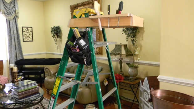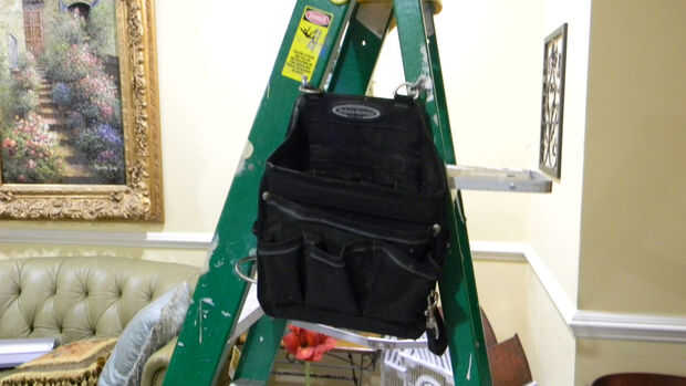 La idea es instalar algún tipo de funda de herramienta y una bandeja que se desliza sobre mi vieja escalera. Tener las herramientas y material en brazos llegar me impide subir y bajar por la escalera con frecuencia. Este hack se hace mi trabajo en mi escalera definitivamente más seguros y más eficientes.