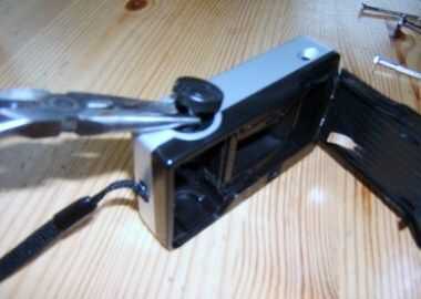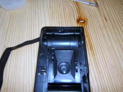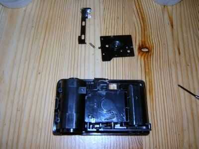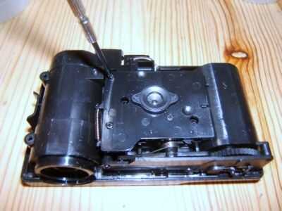3. abrir la parte posterior de la cámara y ubicar los tornillos en el lado izquierdo de la cámara dentro de la cámara de suministro de película. Los saque y añadir a la bandeja con el imán.