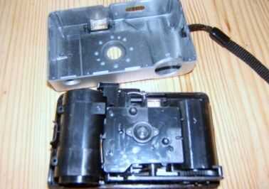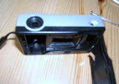 4. cuidadosamente Presione el botón del obturador y comenzar a separar la cubierta frontal de la cámara. Una vez que se va poco a poco, presione el botón de rebobinado y mueva suavemente la cubierta frontal hasta que. Apartar la portada por un tiempo.