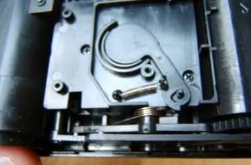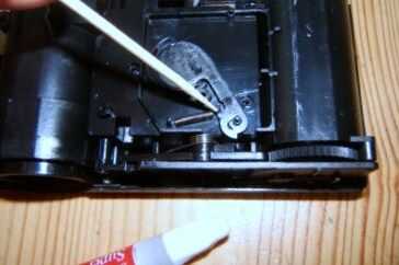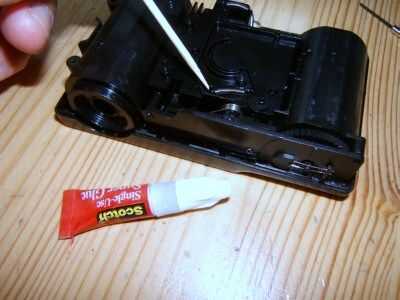 1. antes de empezar fastidiando en la cámara, aseguró el resorte que va desde la pala del obturador a la entrada de la primavera. Añadir un pequeño gota de pegamento de cianocrilato (superglue) a ambos extremos del resorte. Esto evitará perder la primavera.