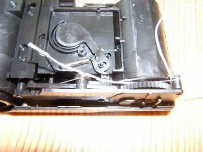 2. accionar el obturador varias veces y notarás la palanca en el lado inferior izquierdo de la cámara. Este es el objetivo para la fijación de la seda dental. Atar con cuidado una longitud de hilo dental alrededor de la palanca. Utilice un clip doblado y pinzas de nariz para ayudar... sus un poco apretado.