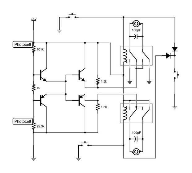 Los relés están allí si topa con un objeto, dependiendo de qué sensor es el bump, girar o invertir. Nunca he sido capaz de construir un puente H con transistores que funcionó muy bien, así que decidí utilizar relés. Funciona fantásticamente en pruebas en mi protoboard, pero no he implementado los todavía, quiero modificar la luz sensor de circuito más antes de añadirlos. Para mí, esto es algo que voy a construir continuamente y cuando pienso en las cosas, y me gustaría utilizar para cubrir los vehículos de Braitenberg en Instructable otro.