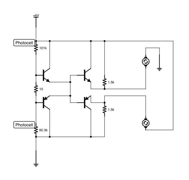 El circuito hará que el robot siga o huir de la luz (si cambia la luz de un lado a otro hará que el robot vaya a o huir de la luz).