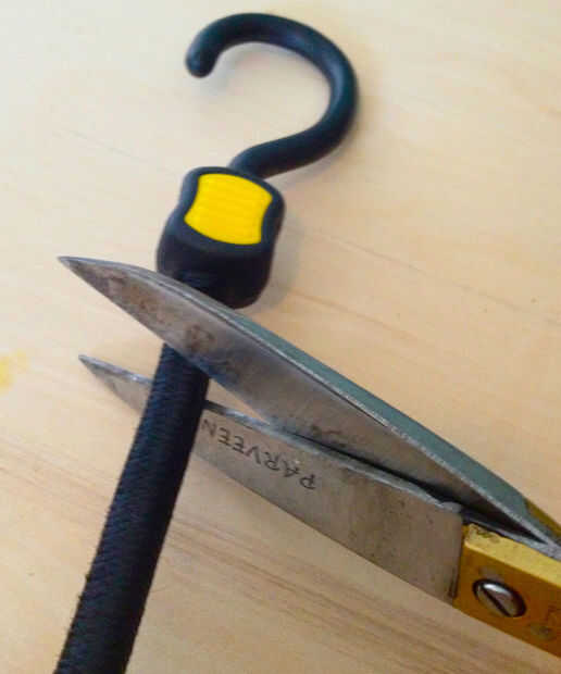 2. use un mechero para derretir los extremos para que no debilite. Sea inteligente acerca de fuego. Esto trabajó muy bien para mi bungee que creo que tiene algún tipo de carcasa de nylon. Si tienes un bungee ubicado en algodón, no intente derretir el final!