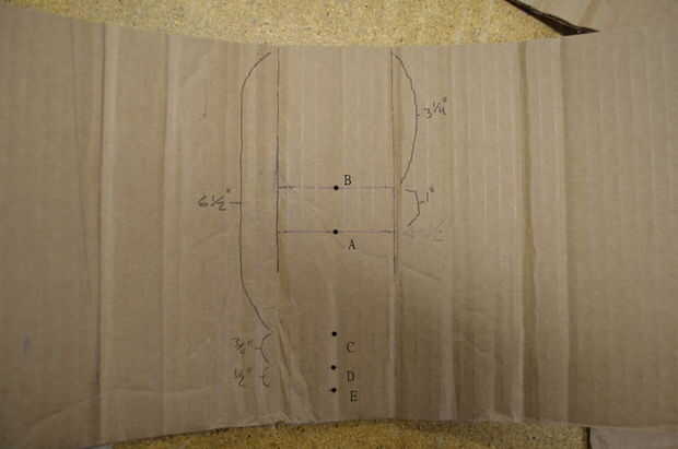 Vale. Dibuja un círculo para el agujero del dedo usando los puntos C y D como la parte muy superior y muy inferior del círculo. Haciendo referencia a ese círculo, dibujar el contorno de su lengüeta para que la ficha se extiende desde E hasta la línea de doblez que trazamos por el punto B.