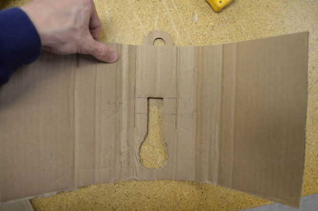 Una vez que haya completado el corte, doblar la ficha a lo largo de la línea de doblez hacia la parte superior del inserto. El agujero del dedo debe ser visible sobre la parte superior del inserto. Es mejor cortar poco profundas y su pliegue Haga primero una prueba ya que no desea que su ficha a manera para arriba sobre el borde del inserto. Es fácil de ajustar la ficha para que sea más largo. Acortar la ficha no es tan fácil.