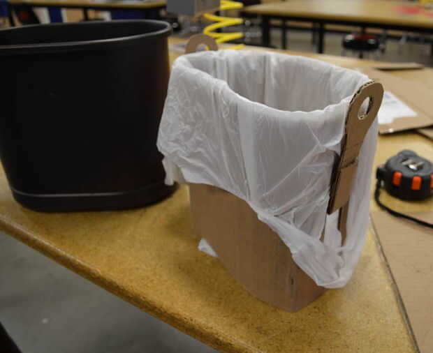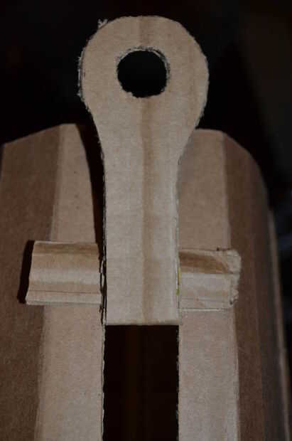Ahora puede mover para ajustar su dispositivo para sus necesidades. ¿Cargar su bote de basura con basura pesada? Usted necesitará reforzar esos pull tabs para no rasgar el cartón. Pegar un trozo de cartón a lo largo de la línea de pliegue (entre la ficha y el prospecto) ayudará a prevenir desgarros. ¿Quieres el bolso que más firmemente se unirá el prospecto? Puede cortar ganchos en los lados del agujero dejado por hacer las lengüetas del tirón.