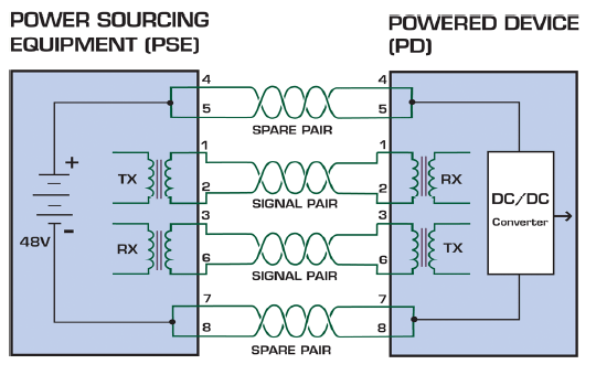Envía colocando un potencial entre cables marrón (-) y dos cables azules (+). Desde desconectar uno de estos pares usando este método, PoE simplemente dejará de funcionar (no es peligroso utilizar dispositivos PoE, simplemente se desconectan los cables).