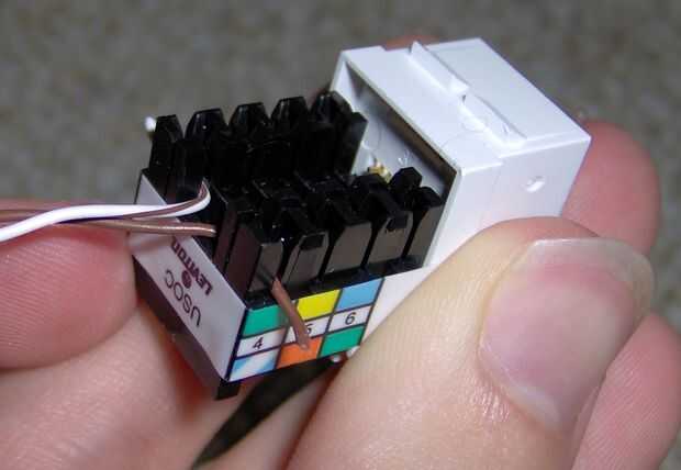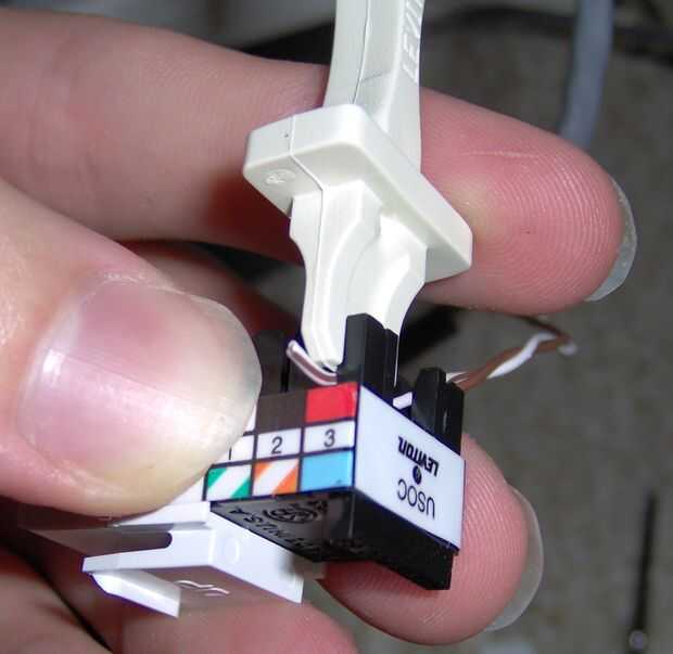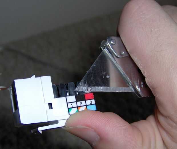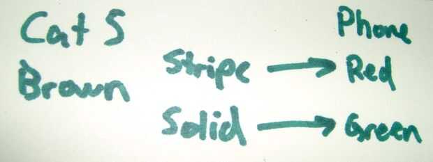 Siga las instrucciones en su toma de teléfono para prensar el par marrón en las ranuras de alambre rojo y verde en el conector. Esto debe hacerse en el mismo orden en cada conexión (véase arriba). Utilice un cuchillo para recortar el extra.