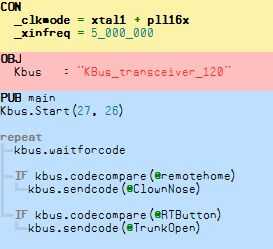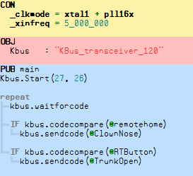 Primero, empezamos por el controlador de Kbus con Kbus.start(27,26), luego entramos en un bucle. El bucle de espera primero un entrante código kbus. Si el código coincide con 'botón de inicio remoto empujó', envía el código 'Parpadea la nariz de payaso'. Si ve que el RTbutton ha sido empujada, envía un código de 'TrunkOpen'.
