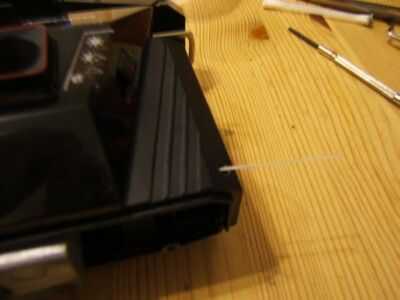 poner la placa en la cámara. Asegúrese de que usted alimenta el hilo dental hacia fuera el agujero que perforó antes. Asegúrese de que el interruptor de apertura involucra el brazo metálico en el conjunto del lente.2. vuelva a colocar los tornillos que fijan la placa frontal.