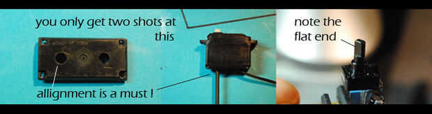 -Taladre dos agujeros de 4,9 mm en la cubierta inferior del servo. Estos deben estar ubicados longitudinalmente a lo largo de la línea de centro y 9,5 mm de cada extremo (esto se aplica en el Hitec HS-300 y también es cierto para muchos servos estándar pero dependiendo del tipo de servo puede haber diferencias). El hilo de rosca M4 salen del cuerpo del servo utilizando uno de estos dos por lo que este orificio debe estar ubicado directamente debajo del centro de rotación del engranaje de salida del servo. Tener mucho cuidado ya que esta alineación es muy importante! Si no entiendes bien que tendrás que usar un servo nuevo! Más precisa, cuanto más durará su servo.
