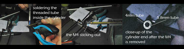-Encender la antorcha de la llama, tome el tubo de 4mm roscado (sujetándolo por el tornillo) y moverlo en el extremo soldado de tubo de cobre de diámetro 5,8 mm que todavía debe ser instalado en el vicio. Usando la antorcha de la llama de calentamiento ambos tubos y cuidadosamente Inserte el 4mm roscado de la tubería interior de 5,8 mm de la tubería hasta es totalmente interior. Utilice un par de pinzas y coloque el tubo de cobre sujetando el extremo del tornillo que sobresale. Mantenga el tubo roscado nivelada dentro del tubo de 5,8 mm hasta que la soldadura se instala. Si no tienes una antorcha de fuego utilice una vela, el soldador y su paciencia:). Quite el tornillo. El resultado final será el cilindro de su actuador lineal.