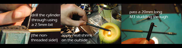 -Cubrir toda la longitud del cilindro con reducción de calor de tubo y corte cualquier exceso pedacitos. 2,5 mm a través de agujeros hechos en la parte no fileteada del cilindro está ahora protegida. Utilice el taladro nuevo para exponerlos y tap a través, usando el grifo M3. Tornillo de un largo entramado de M3 20mm o simplemente corte la cabeza de un tornillo de M3 largo 20mm. Esto actuará como bisagra de montaje de la botella.