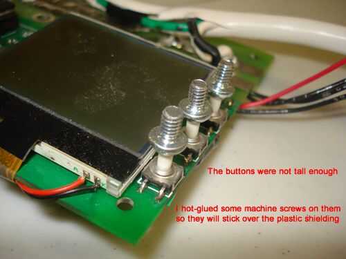 Caliente pegué unos 0,25" larga #8 tornillos para los botones de modo que sobresalgan sobre el protector de plástico.