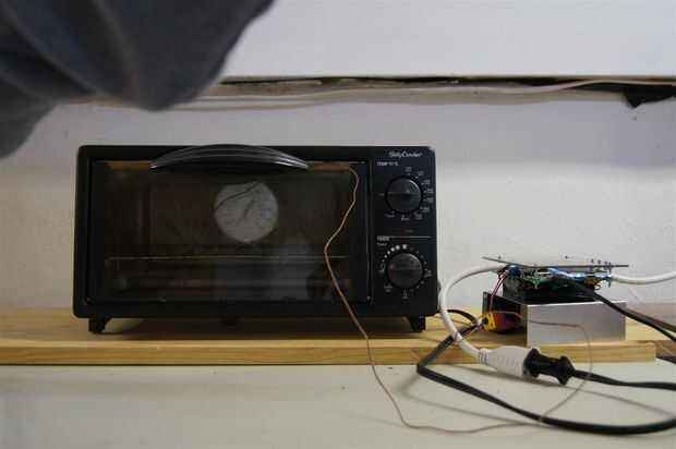 - Enchufe el horno tostador modificado. Inserte el termopar dentro del horno de la tostadora. Atado un nudo para sujetarla de manera que no ponga en contacto el metal interior.