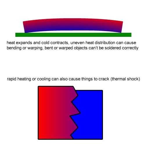 En segundo lugar, recuerda que calor expande materiales y frío contratos de materiales. Demasiado rápido de calefacción o enfriamiento demasiado rápido puede causar grietas. Distribución desigual de la temperatura puede causar cosas doblar o deformar. No desea cosas para romper, y cosas que están dobladas no suelde correctamente debido al mal contacto.