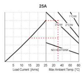 De la hoja de datos, hay un gráfico (ver galería) que muestra lo que debe ser la resistencia térmica del disipador de calor. Voy a utilizar 25 grados centígrados como temperatura ambiente y 15A. Si nos fijamos en el gráfico, podría pensar un 4 C/disipador de calor W es suficiente.