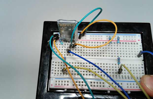 HC-05 en el tablero de pan para que el voltaje había dividida línea Tx (Uno D3, Mega D16) de Arduino es conectado a la Rx del módulo y el Tx línea de la HC-05 está conectado directamente a la línea de Rx (D2 Uno, Mega D17) de Arduino.
