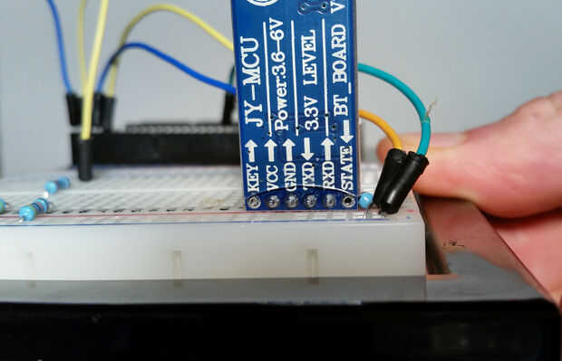 Conectar los puentes de los + 5V y el carril de tierra del tablero de pan a los pines VCC y GND de la HC-05.