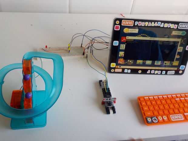El concepto es hackear un circuito de bolas con frambuesa ordenador Pi 2 Kano y agregar un sensor y luces para más diversión.