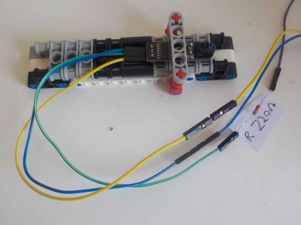 Primero hacemos el apoyo de Lego. Luego agregamos puentes para el sensor de infrarrojos. El sensor tiene tres pines "machos" y en nuestro modelo están etiquetados como GND, Vcc, Out. La tierra se conectará a una toma de tierra de frambuesa Pi Kano, así que agregamos un puente. El Vcc es la fuente de alimentación, nos conectamos a una resistencia de 220 Ohm con un puente y añadimos otro puente en el otro extremo de la resistencia para poder conectarse a una fuente de alimentación de 5V de GPIO de la Raspberry Pi. El pin Out es la salida y se conectará a otro GPIO, así que añadir un puente.
