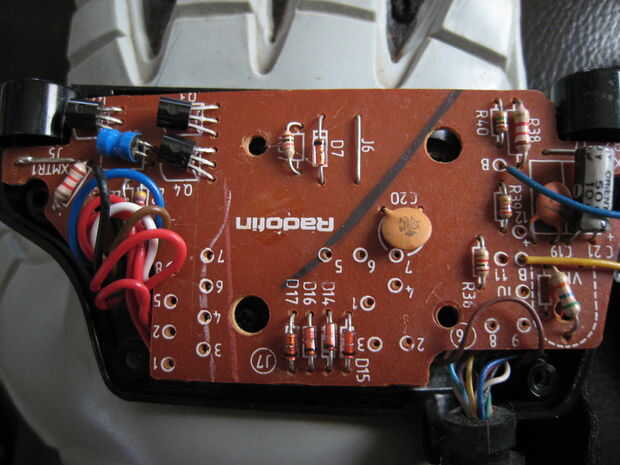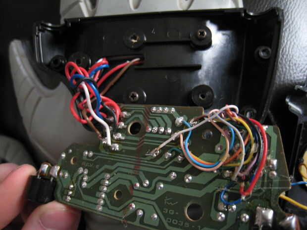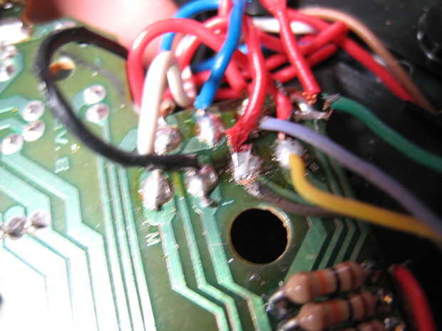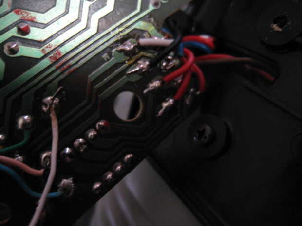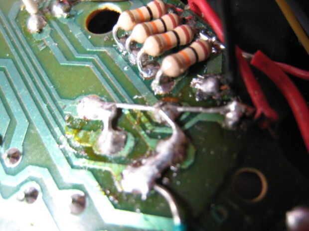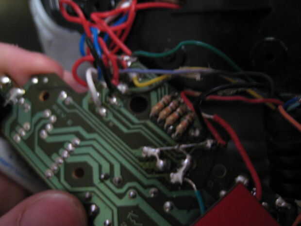 Queremos abrir la palma para exponer a la Junta. Una vez que tenemos encontrar donde conectar los sensores a la Junta. Habrá 4 diodos por allí. Vamos a desoldar los diodos y reemplazar a aquellos con las resistencias de 10 k. Conectar el positivo a uno de los dos cables de cada sensor. Entonces conecte la tierra a las resistencias y conecte los cables del segundo cable del sensor. Fotos le ayudará a explicar esto mucho mejor.
