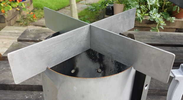 Hasta luego necesitas corte unas muescas para que el soporte se sentará firmemente en la parte superior de la chimenea. Simplemente medido donde debe ser, marcado y hecho 5mm muescas profundas triangulares con un archivo en forma de triángulo. (En mi caso estas muescas eran cada uno de aproximadamente 90-95mm desde la muesca central, pero esto puede variar ligeramente, por lo que recomiendo medir y centrado el pan apoyo en tu estufa individual)