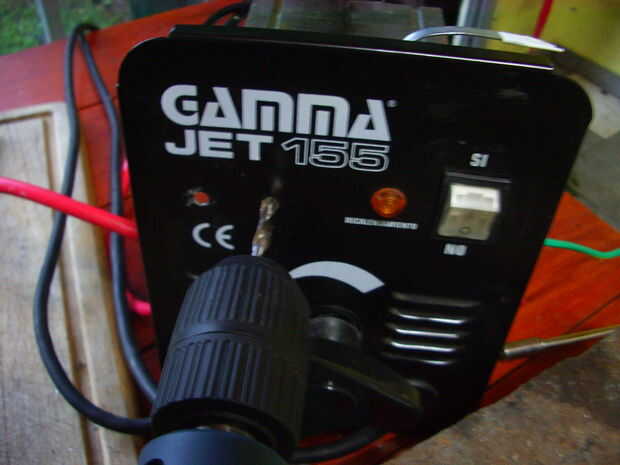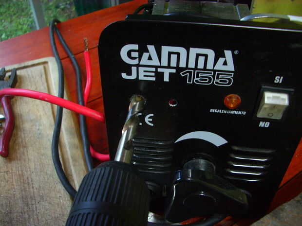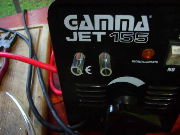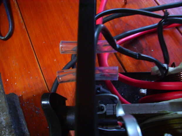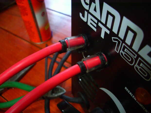 Para atravesar la chapa con los cables necesitaba tapones de goma perforados, pero no pude conseguirlos. Así compré un trozo de manguera de pvc blando transparente de diámetro interior igual al exterior del cable. La corté en dos trozos de unos 6 cm de largo, y los atravesé en los agujeros de 12 mm. Tuve usar jabón como lubricante, otra vez. Fijé los trozos de manguera en sus lugares con precintos de plástico, y los cables también. Coloqué los terminales en sus lugares, y armé nuevamente la soldadora.