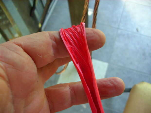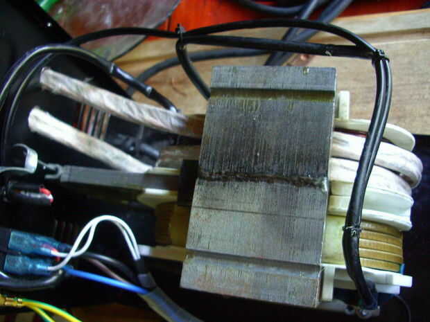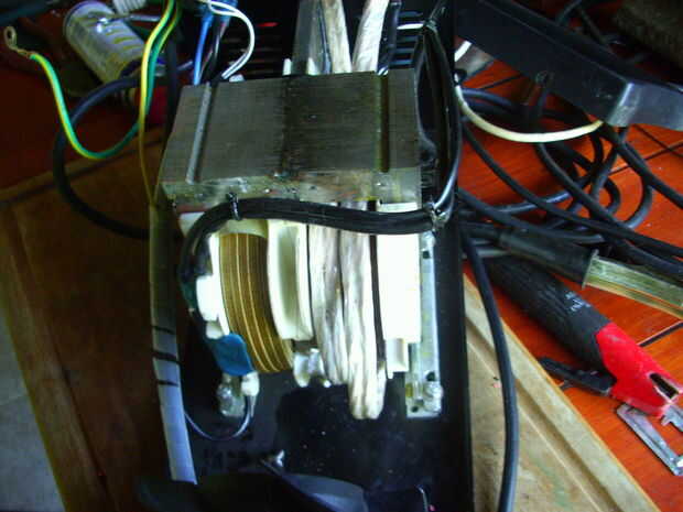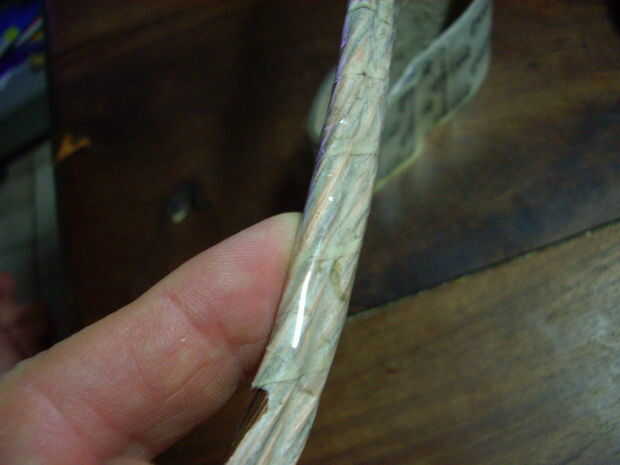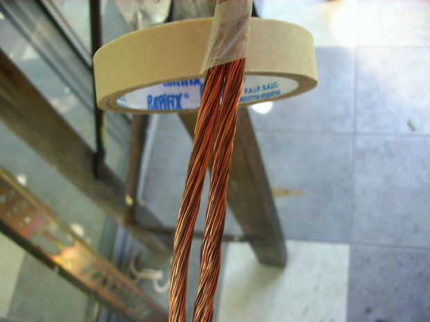 fluye a través de los cables de salida, como simplemente añadiendo un nuevo cable. Así es. Compré un adicional 1,5 m el cable 16 mm2, y puesto que era imposible para ambos cables en el agujero disponible, lo primero fue quitar el aislante de ambos. Una vez que ambos cobre pelado, tuve que resistir la tentación de girar para hacer un solo conductor cilíndrico, porque no había cupo en el transformador. Primero envuelve les con cinta adhesiva, tratando de permanecer plano y paralelo como sea posible. Cuando empecé a enrollar en su lugar, me di cuenta de que la cinta adhesiva fue pelada en todos los lugares donde tocar el núcleo de hierro. Así que saqué los cables y cubiertas con cinta adhesiva, que es muy fino, muy resistente y más resbaladizo. Me dio bastante trabajo enrollar el montaje, de todos modos.