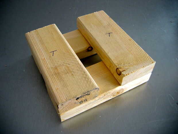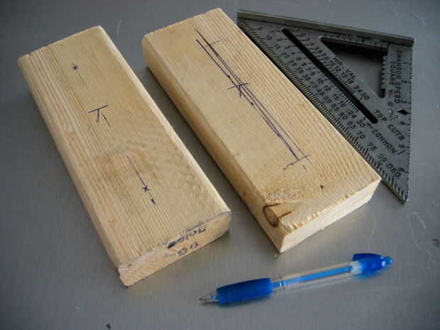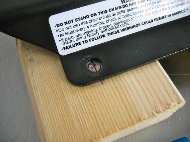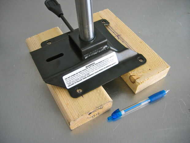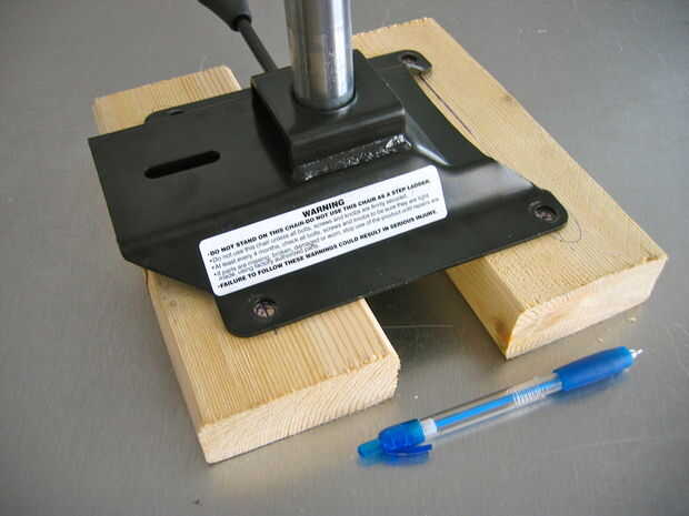 Pero aproximado no es suficiente! He invertido las heces (sin asiento) y alineados los orificios en la brida con las líneas del centro en mi 2x4s. Centrado en piezas de madera debajo de la brida lo mejor sería y entonces marcados los agujeros en la madera con un lápiz.