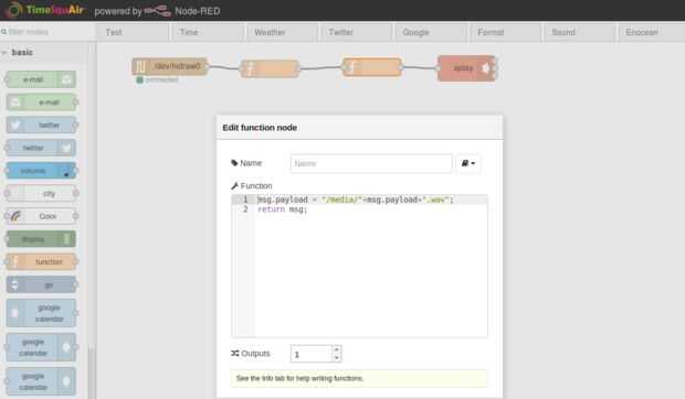 Añada un nodo "exec" y establece como la segunda foto en. Aquí utilizamos el comando "aplay". El parámetro "Append msg.paylod" debe revisarse, para añadir la ruta completa del sonido (calculado en la función anterior) después del comando aplay. Activar todos los nodos.
