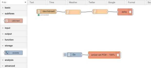 Si el volumen es demasiado bajo puede añadir otro nodo "exec" y escribir en la sección de comando "" amixer set PCM – 100% ", activar luego click en"Go"(tercera foto).