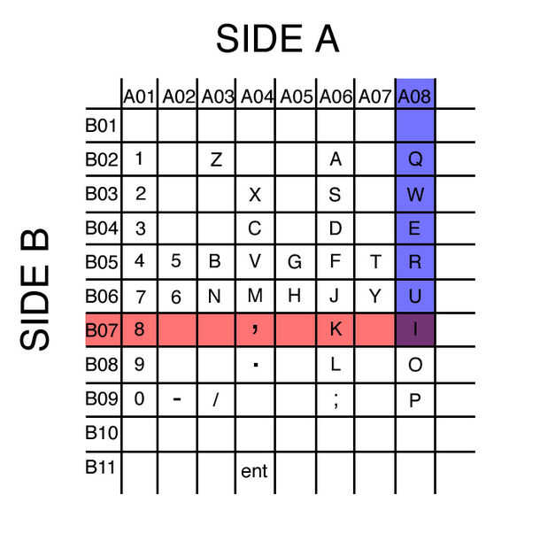 Si conecta "Pin 8" en el lado A y "Pin 7" en el lado B producirá la letra "I" en el equipo (ver imagen).