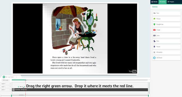 Actualmente, el cuadro de texto aparece en o muy cerca del comienzo de la Página 1, pero probablemente no termina en el momento correcto. Arrastre el punto verde en la línea de tiempo y soltar antes el video cambia a página 2. Se debe hacer una pausa, y usted debería ver una línea roja que viene desde la parte inferior del punto verde. Utilizando la línea de tiempo, establece una hora de fin para el cuadro de texto haciendo clic y arrastrando la flecha verde derecha y caer donde se encuentra con la línea roja.