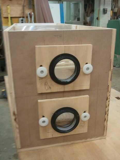 Abrir aberturas en el panel frontal de la caja y montar tus lentes de proyección. Es bueno dejar un margen para ajustar su posición en el final, para corregir errores e imprecisiones en la fabricación. Para ello, permitió los pequeños paneles que sostienen mis trillizos a mover arriba y abajo gracias a las perillas que puedo apretar manualmente.
