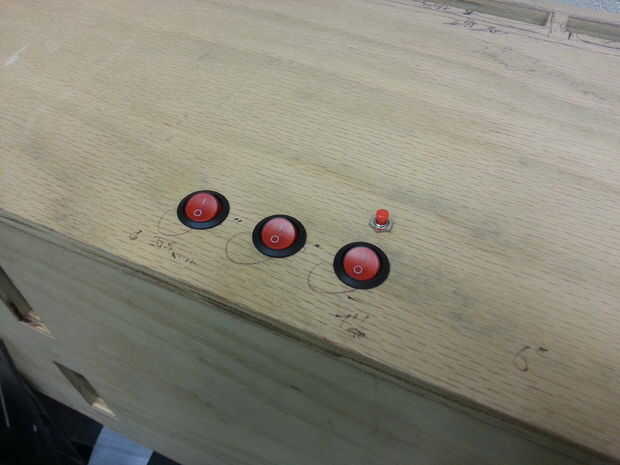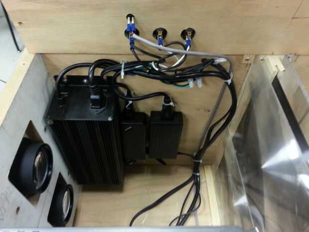 Correctamente la electrónica en el compartimiento delantero, donde es frío de montaje, fije los cables a lo largo de las paredes de modo que no avanzan en el camino de la luz. Agregar algunos switches y conectores eléctricos para poder operar el proyector sin tener que abrir la caja y recortar algunas aperturas para tener acceso a la USB y VGA puertos de la computadora portátil, para que sea posible/fácil de copiar archivos, iniciar videos, etc.