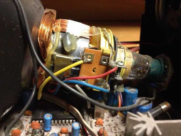 Antes de comenzar, es importante que te das cuenta de los riesgos involucrados con un televisor analógico de hacking. El peligro principal aquí es el transformador flyback. Situado en la imagen de arriba, este dispositivo puede almacenar una carga desagradable que puede lesionarle gravemente si no tienes cuidado. Desconfíe sobre todo si usas una TV más grande, como el transformador probablemente almacenará energía aún más. Debido a esto, es una buena idea usar guantes aislantes al manipular la placa de circuito y las conexiones dentro de la TV.