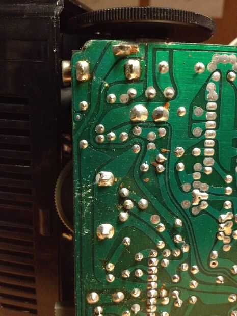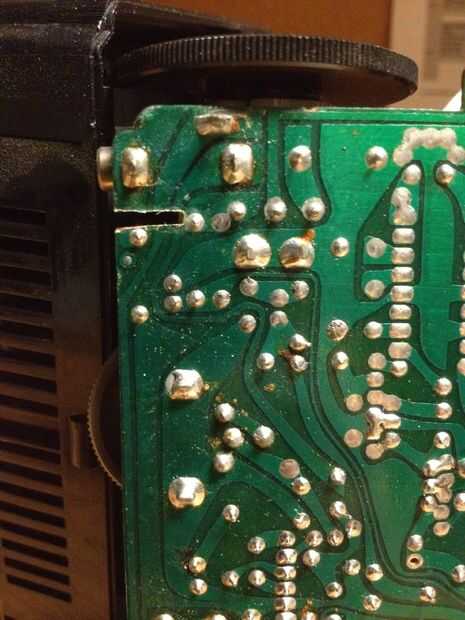 La toma de audio tiene tres puntos de conexión. En el frente del gato (más cercano a la parte exterior de la TV) es para la tierra. En la parte posterior de la toma es para señal de audio. La conexión restante se utiliza para apagar de la externa sonido cuando la toma de audio está en uso. Cortar los rastros "fools" la TV en el pensamiento de que el gato está en uso. Para resolver este problema, la soldadura de los rastros que iban al segundo y tercer conector juntos. La tercera foto de arriba debería dejar esto más claro.