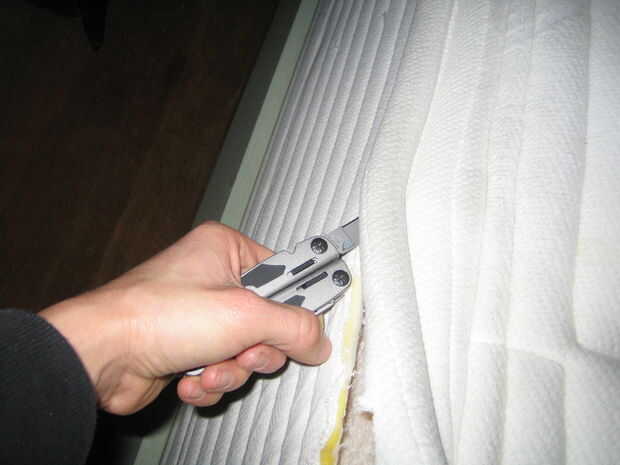 Así que el primer paso es sacar la envoltura de la cama y apuñalar con un cuchillo bien afilado. Asegúrese de cortar por debajo de la tapa de la almohadilla para que pueda quitar como una pieza entera. También, asegúrese de que no a tu espuma, puede ser muy suave.