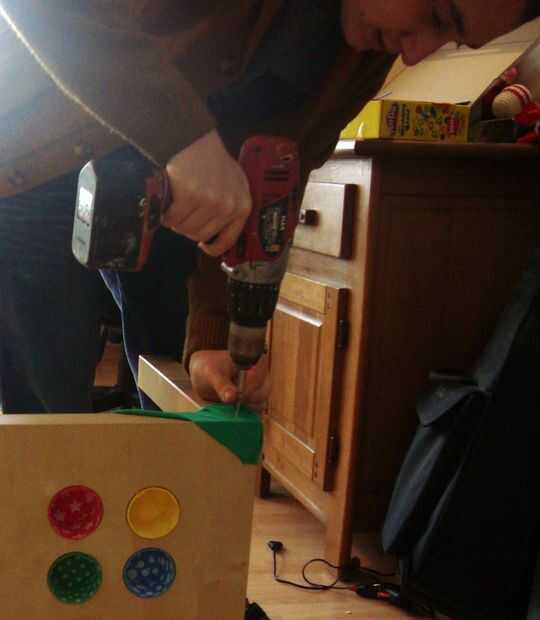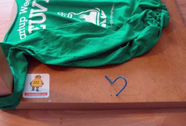 Por otro lado, para mantener la bolsa del suelo y fuera del camino cuando su niño está sentado en la mesa, perforé dos agujeros en el borde posterior de la mesa a unos 2 cm de lado. Entonces tomé un corto lo pedazo de alambre eléctrico y doblado en su lugar, a través de los nudos en la parte inferior de la bolsa.