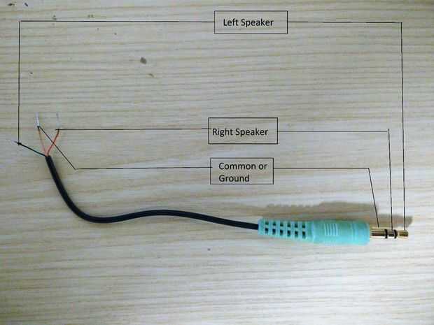Con un multímetro, identificar los cables del cable estéreo. El color puede variar desde un cable a cable. Las salidas de pin del cable utilizado se muestran en la imagen.