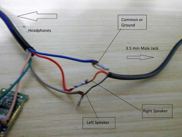 Conecte los hilos del cable estéreo y los cables de los auriculares como se muestra en la imagen.