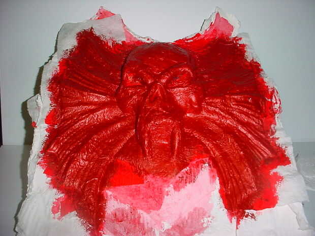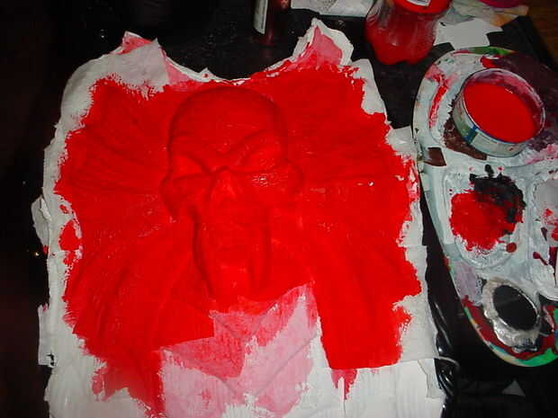 Quería una capa roja, usé una pintura de arte rojo ligeramente enrarecido poner más tejido sobre las zonas ásperas y luego aplica dos capas de pintura acrílica rojo y cobre el arte metálico
