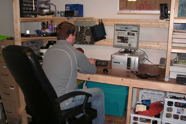 tuve un amigo sentarse en la silla y probar 2 meses luego de construido y primero utilizado. Él dijo, "es perfecta". Estas son algunas imágenes de él sentado en la silla alta de Hill Billy y navegando por la web en mi escritorio/Banco de trabajo alto.