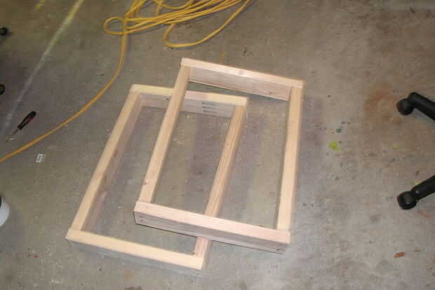 Construcción de piezas de la parte superior del marco por 18 pulgadas de adyacentes a los extremos de las piezas de 23 pulgadas. Esto resultará en dimensiones exteriores de 18 x 26 pulgadas. Para ello, previamente había perforado dos agujeros para cada conexión y me sujeta los tornillos de rosca gruesa con (2) de 2.5 pulgadas. Construir el cuadro inferior de la misma manera exacta.