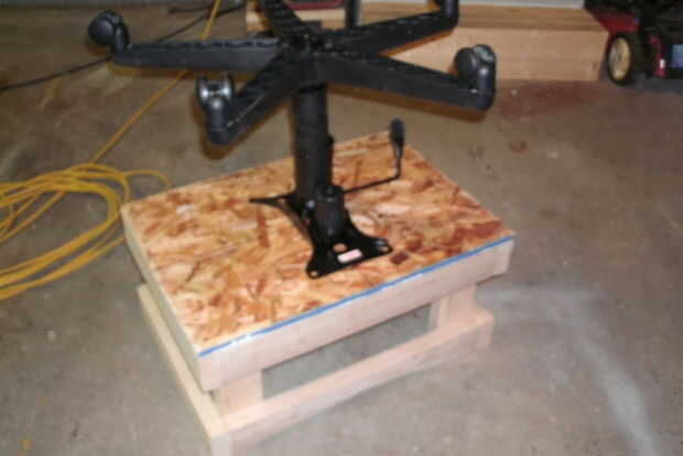 Antes de todo esto, tuve que determinar cuál era la posición óptima para la base giratoria que se unirá a mi marco desde el centro de gravedad de la silla ahora ha sido cambiar drásticamente. Necesitaba encontrar una posición adecuada, así que cuando la persona sentada en la silla se inclinó atrás/adelante o derecha/izquierda la silla no se vuelque. Para ello solía un par tornillos con las arandelas de 0,25 pulgadas Conecte temporalmente la base... entonces me senté en el marco en varias posiciones para probar la estabilidad. Tomó un par de intentos, pero he encontrado la mejor posición en cuanto a la columna base giratoria para ser centrada de izquierda a derecha y un poco detrás del centro del marco del cuadro para anular la natural inclinación hacia atrás de la silla. Imagen 4 muestra la fijación temporal de rápido cambio y ajuste, mientras que la imagen 5 muestra mi intento de configuración inicial. Imagen 6 la colocación final y rendido el mejor equilibrio.