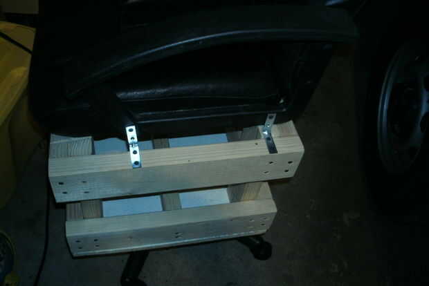 Este paso requiere algún tiempo para determinar cómo fijar la silla a la nueva estructura. No quería que las Naciones Unidas-tapizar la silla para fijar a la estructura ni nada como eso... Así que encontré un ángulo de 2 pulgadas en casa soportes Depot que sujeta la caja de madera y los brazos de plástico duros de la silla original. Estos soportes de prevenir que la silla deslice fuera del marco, que no soportar ningún peso de la persona sentada en la silla, simplemente lateral o torsional cargas que estar son escasas.