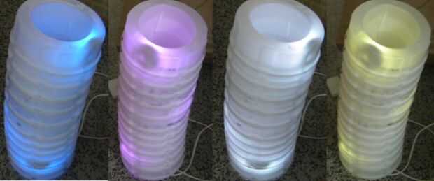 Una vez que se monta la torre, puede energía y disfrutar de una luz cambiante difusa de una torre de cassettes de la papelera de reciclaje.