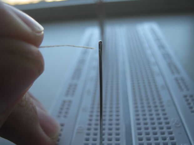 Puede utilizar el tablero otra vez en este paso. Tomar la aguja que quieres hilo fuera de la alineación. Corte un trozo de hilo. Hacer el extremo mojado para enderezarla. Pase la banda de rodadura por el agujero. Puede utilizar la instrucción de las personas normales desde aquí en http://www.wikihow.com/Sew-a-Button
